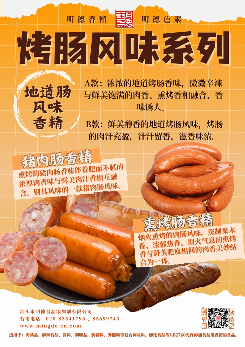 明德烤腸風味系列香精 煙熏肉香 層次真實汕頭市明德食品添加劑有限公司推出的烤腸風味系列香精,覆蓋地道腸風味香精、豬肉腸香精、熏烤腸香精等多種調性。產(chǎn)品風味真實、留香穩(wěn)定,適用于肉制品、復合調味、腌制與外撒粉等B端工廠,幫助快速打造具有記憶點的烤腸類風味。