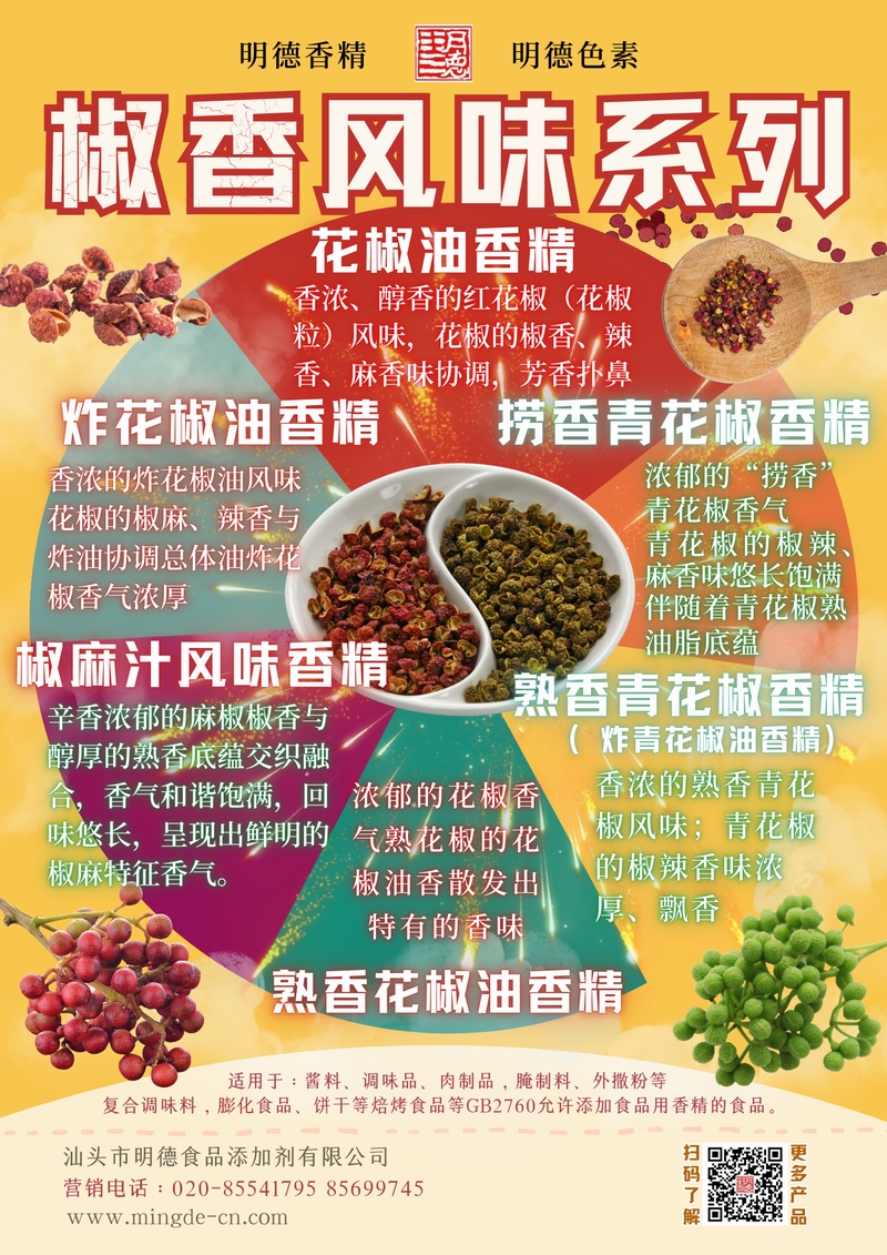 汕頭市明德食品添加劑有限公司的椒香風味香精系列,涵蓋花椒、炸花椒、搗香青花椒、椒麻汁風味、熟香青花椒及熟香花椒等多種類型。產品具有真實的椒香、麻香、辣香及油脂香特征,適用于醬料、調味品、肉制品、腌制料及復合調味料等B端應用,助力工廠快速打造風味豐富、層次鮮明的椒香產品。
